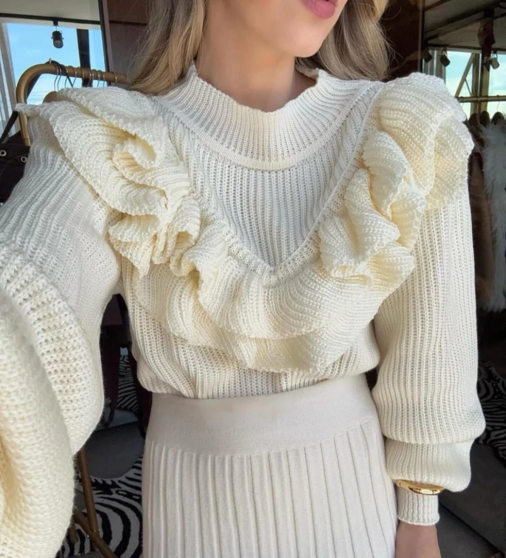 Blusa Tricot Anelise confeccionada em fio de alta qualidade e toque super macio! Esse tricot é aquele mix perfeito entre delicadeza e presença, ele traz um caimento confortável com destaque total para os babados volumosos que contornam os ombros e decote em V, criando uma silhueta super charmosa e feminina. Ele garante aquele visual fofo com um toque fashionista. Ideal pra combinar com jeans, saias midi ou até sobrepor a vestidos. Uma peça que fala por si só e transforma até o look mais básico em produção fashionista.
